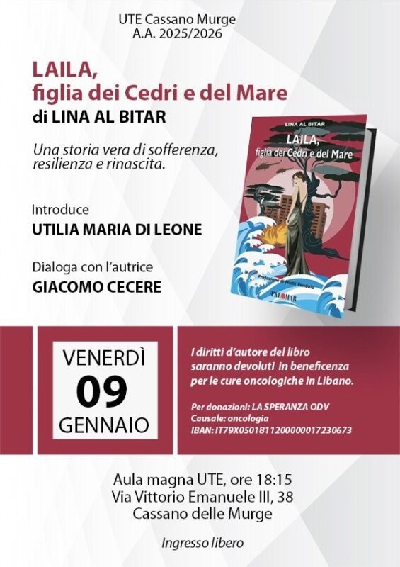 L’Università della Terza Età (UTE) di Cassano delle Murge è lieta di invitare la cittadinanza alla presentazione del libro “Laila, figlia dei cedri e del mare”, della scrittrice libanese Lina Al Bitar.