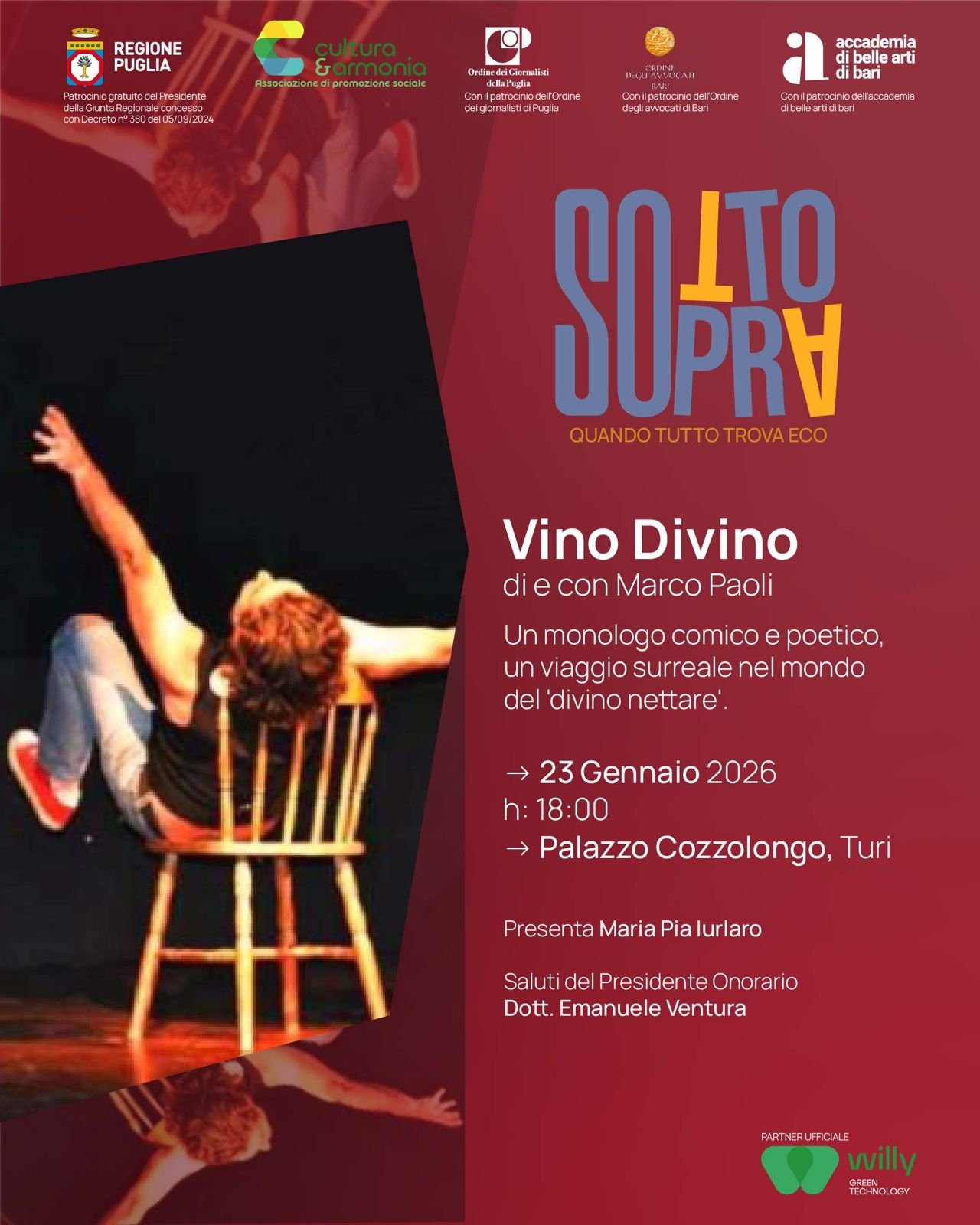 Il prossimo 23 gennaio 2026, alle ore 18:00, la splendida cornice di Palazzo Cozzolongo a Turi accoglierà “Vino Divino”, spettacolo teatrale scritto e interpretato da Marco Paoli. L’evento si inserisce all’interno della rassegna “Sotto Sopra – Quando tutto trova eco” ed è promosso dall’associazione di promozione sociale Cultura & Armonia.