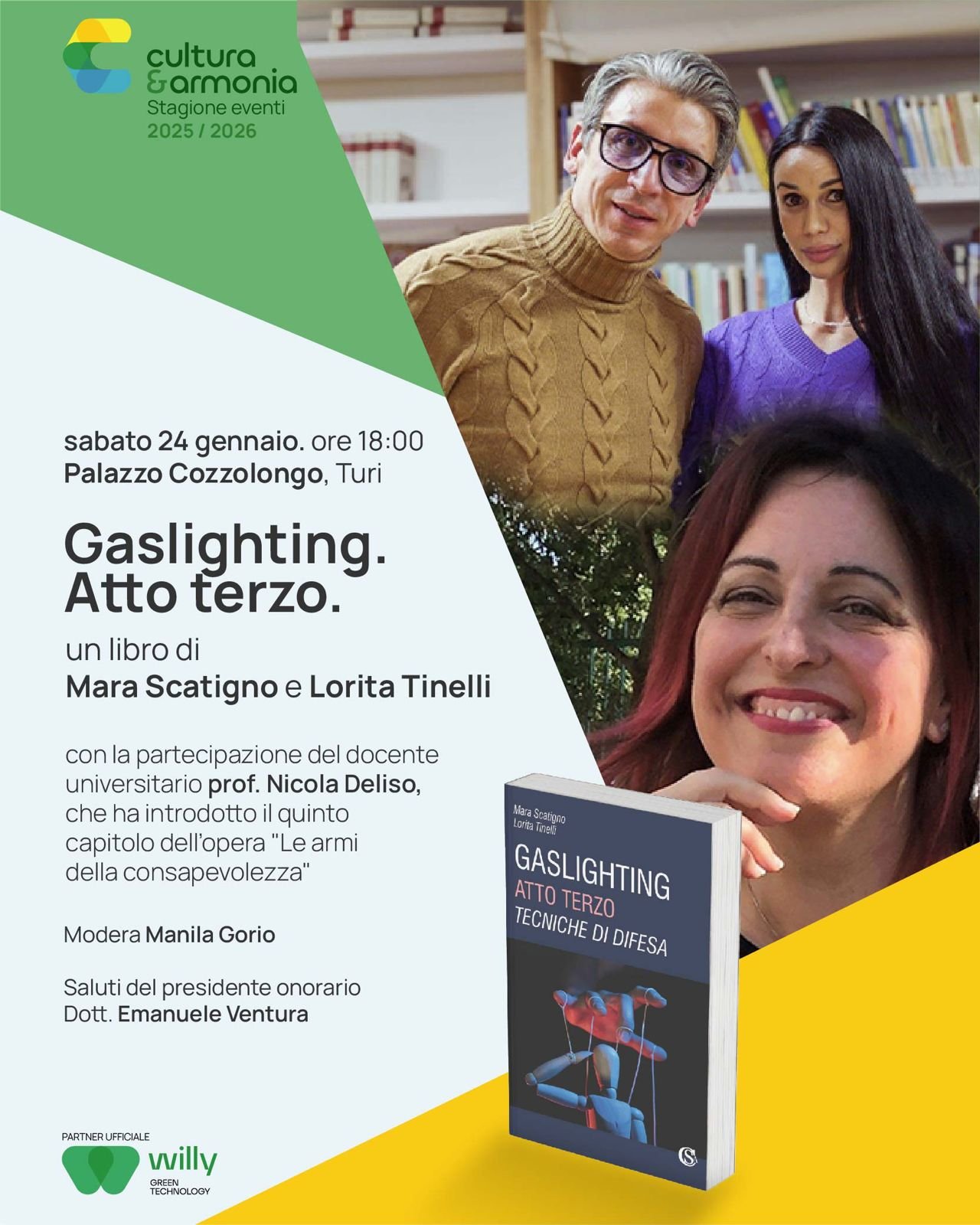 Sabato 24 gennaio alle ore 18.00, presso Palazzo Cozzolongo, si terrà la presentazione del libro “Gaslighting. Atto terzo. Tecniche di difesa” di Mara Scatigno e Lorita Tinelli, nuovo appuntamento della stagione eventi 2025/2026 di Cultura & Armonia.