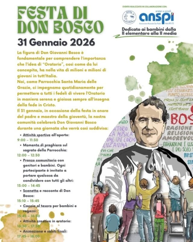 Una giornata speciale dedicata alla festa degli oratori e alla celebrazione di Don Bosco, padre degli oratori, sabato 31 gennaio 2026 presso la Parrocchia “Santa Maria delle Grazie” di Cassano delle Murge.