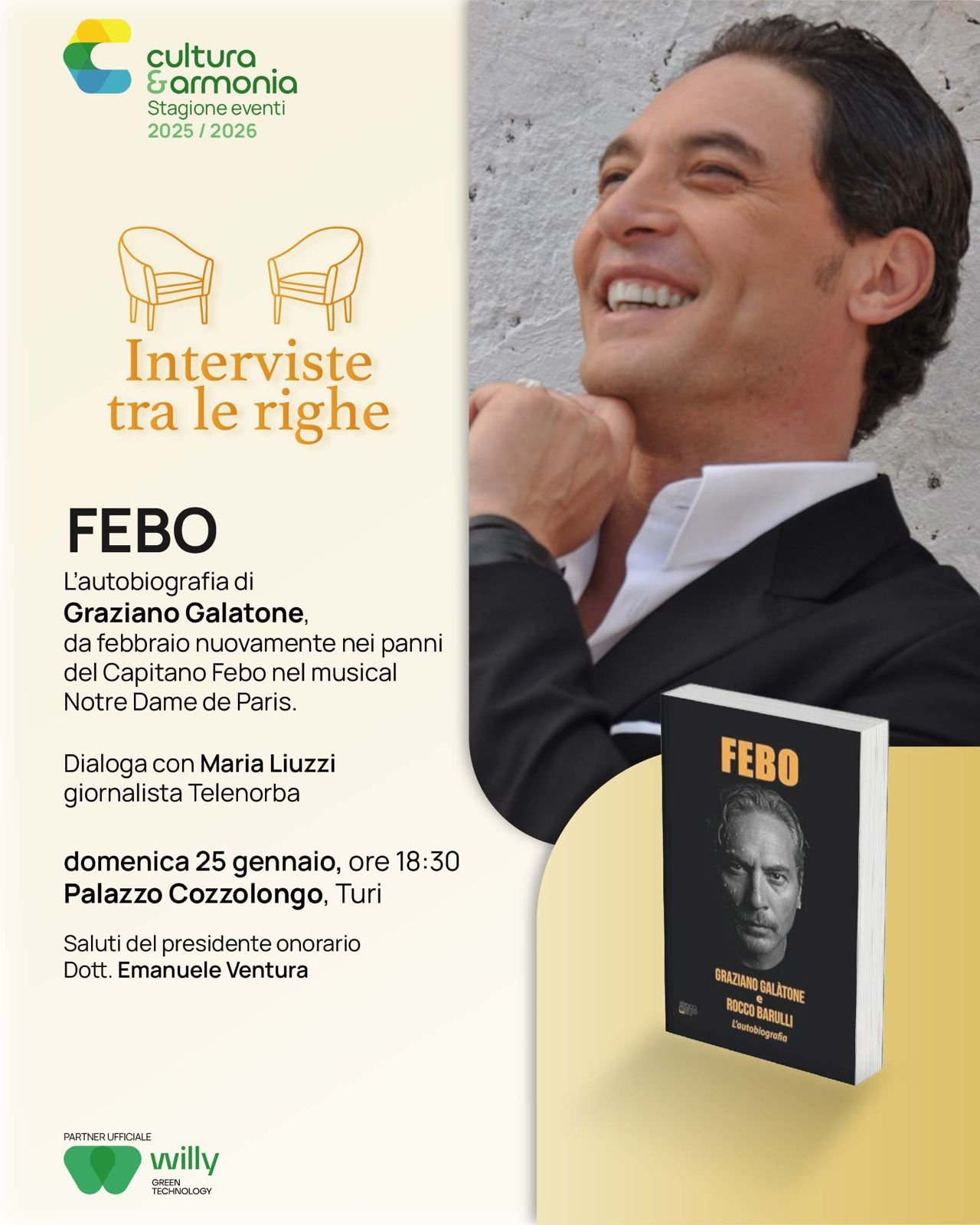 Domenica 25 gennaio, alle ore 18:30, nella prestigiosa cornice di Palazzo Cozzolongo a Turi, protagonista sarà Graziano Galatone, attore e performer tra i più amati del panorama teatrale italiano, che presenterà “FEBO”, la sua autobiografia.
