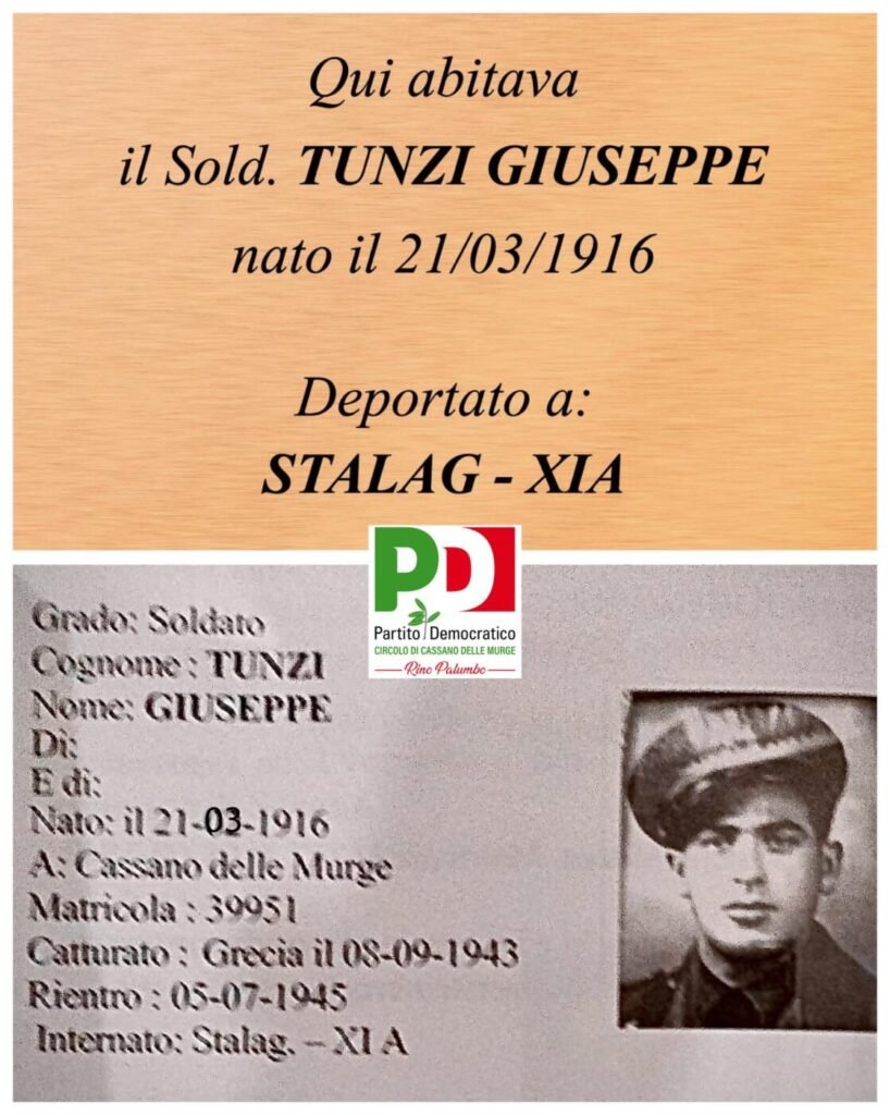 “La fotografia e la lettera che ci restano di lui non sono solo documenti storici: sono frammenti di umanità, testimonianze silenziose di una generazione travolta dalla guerra, privata della libertà, degli affetti, spesso della giovinezza stessa – spiega in una nota il PD cassanese – Apporre una targa su un muro, davanti a una casa, non è un gesto formale. È un atto di responsabilità collettiva. Significa ridare un nome e una storia a chi rischia di essere inghiottito dall’oblio. Significa ricordare che dietro i grandi eventi della Storia ci sono vite concrete, strade, famiglie, quartieri. In un tempo in cui la memoria viene spesso banalizzata o dimenticata, fermarsi insieme, nel luogo dove Giuseppe Tunzi ha vissuto, è un modo per dire che la memoria è un dovere civile, e che il passato continua a interrogarci sul presente. Per ricordare. Per comprendere. Per non dimenticare”.