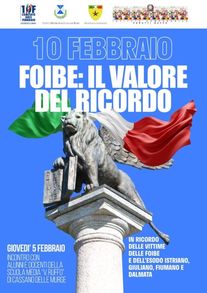 In occasione del Giorno del Ricordo, oggi 5 febbraio, si terrà a Cassano delle Murge presso la Scuola Media V. Ruffo l’iniziativa “Foibe: il valore del ricordo”, promossa dal Comitato Dieci Febbraio Cassano delle Murge in collaborazione con l’Istituto Comprensivo “Perotti-Ruffo”, con il patrocinio della Città Metropolitana di Bari e della Presidenza Nazionale dell’Associazione Nazionale Sottufficiali d’Italia (ANSI).
