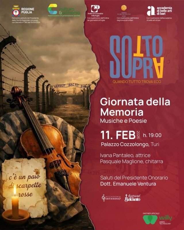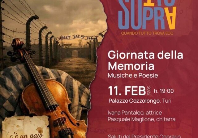 In occasione della Giornata della Memoria, martedì 11 febbraio 2026 alle ore 19.00, lo storico Palazzo Cozzolongo di Turi ospiterà un intenso appuntamento culturale dedicato al ricordo, alla riflessione e alla responsabilità della memoria collettiva, attraverso musica e poesia.