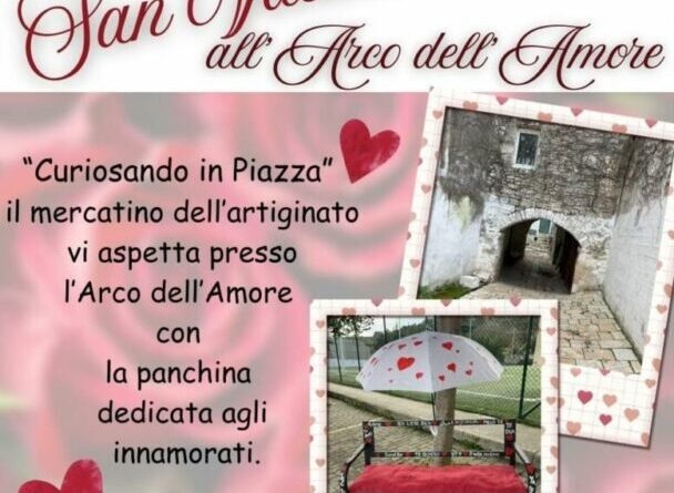 Avrà luogo domani, sabato 14 febbraio dalle ore 10:00, l’evento “San Valentino all’Arco dell’Amore”. La celebrazione della festa degli innamorati sarà il tema centrale del mercatino dell’artigianato “Curiosando in Piazza”, organizzato dall’associazione di promozione sociale “Primule Rosse” in collaborazione con il Comune di Cassano delle Murge.