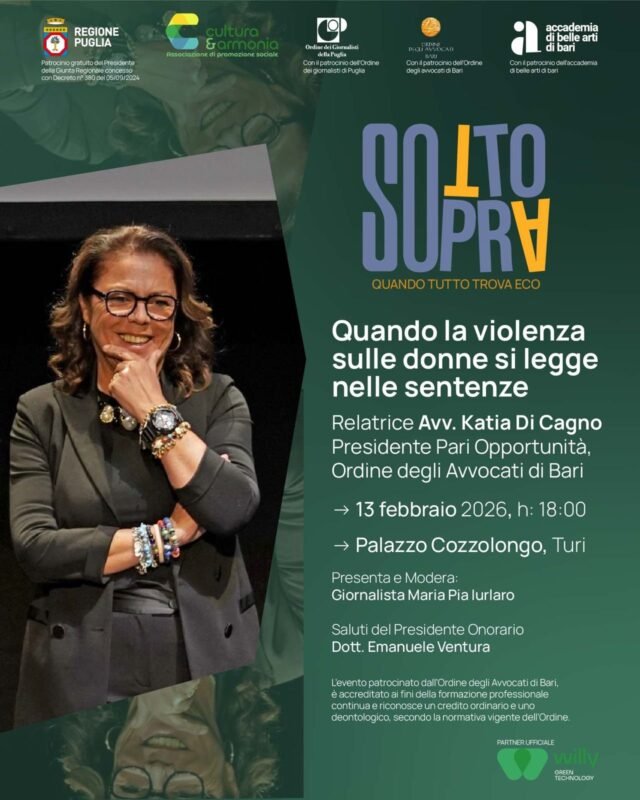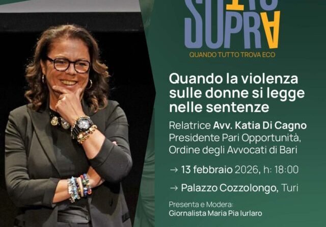 Un’occasione di riflessione profonda sul rapporto tra giustizia, linguaggio e responsabilità sociale: venerdì 13 febbraio 2026, alle ore 18:00, presso Palazzo Cozzolongo a Turi, si terrà l’incontro “Quando la violenza sulle donne si legge nelle sentenze”, inserito nel ciclo culturale “Sotto Sopra – Quando tutto trova eco”.