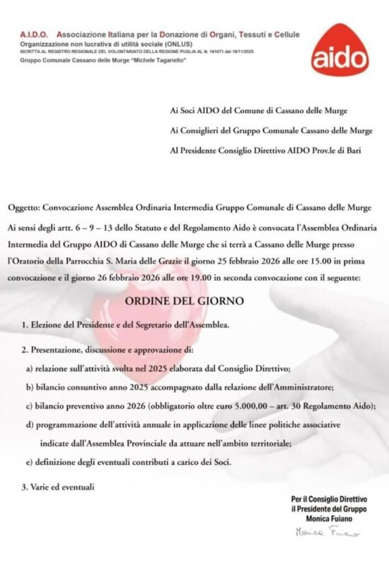 Giovedì 26 febbraio alle ore 19.00 presso l’Oratorio di S. Maria delle Grazie di Cassano delle Murge è convocata l’Assemblea Intermedia del Gruppo Comunale AIDO di Cassano delle Murge “Michele Tagariello”. Tutti coloro che sono iscritti all’AIDO sono invitati a partecipare.