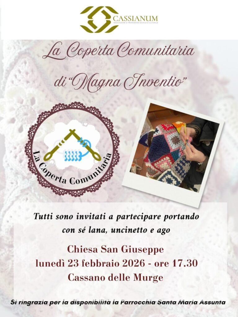 Prosegue incessante il lavoro ai ferri e all’uncinetto delle volontarie della “Coperta Comunitaria” all’interno della manifestazione “Magna Inventio” 2026 a cura dell’Associazione “Cassianum”: il prossimo incontro è fissato per lunedì 23 febbraio alle ore 17.30 presso la Chiesa di San Giuseppe, nel centro storico del paese.