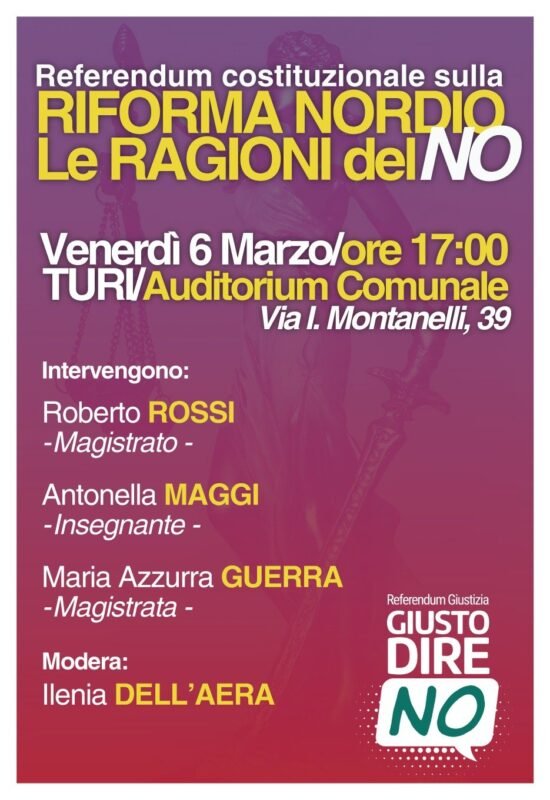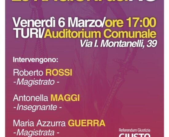 Il ciclo di incontri informativi proseguirà venerdì 6 marzo, sempre presso l’Auditorium comunale di Turi. Interverranno i magistrati Roberto Rossi e Maria Azzurra Guerra, insieme all’insegnante Antonella Maggi. A moderare sarà Ilenia Dell’Aera. Un nuovo appuntamento che si propone di proseguire il percorso di approfondimento in vista della consultazione referendaria.