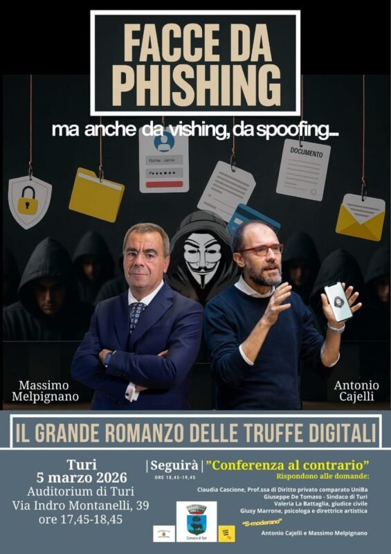 Il 5 marzo (ore 17.45) l’Auditorium di Turi ospita “Facce da Phishing – Il grande romanzo delle truffe digitali”, un incontro pubblico dedicato ai rischi di phishing, vishing e spoofing e agli strumenti per difendersi.