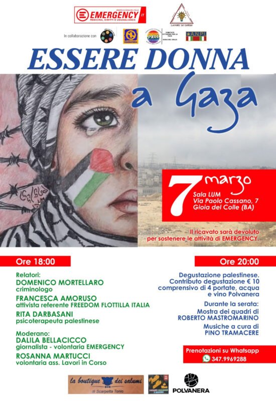 A ridosso della Giornata Internazionale della Donna, il gruppo EMERGENCY di Gioia del Colle invita la cittadinanza a un incontro “Essere Donna a Gaza” che va oltre la semplice cronaca: un viaggio profondo nel cuore della Palestina.