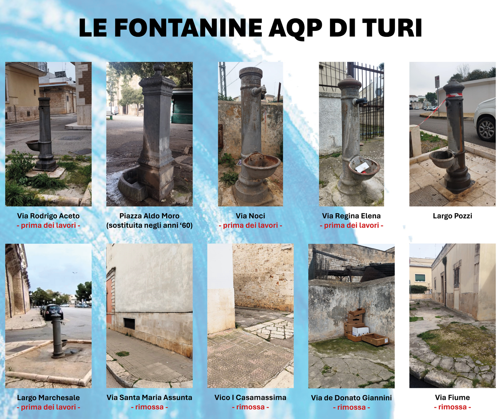 Per molti pugliesi quelle fontane non erano soltanto un servizio pubblico, ma veri e propri simboli di comunità, cui era riservato un affetto incondizionato, nutrito da ricordi personali e collettivi.