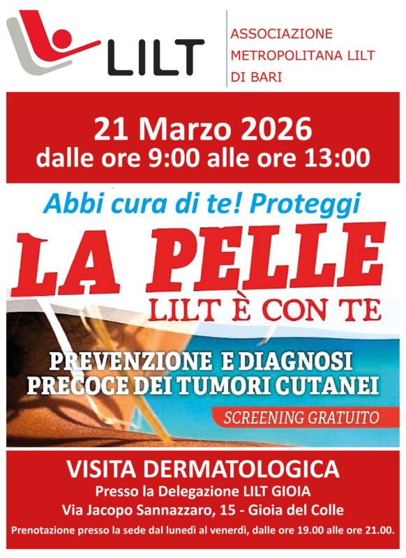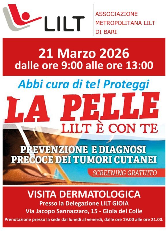 Mentre la primavera si risveglia, portando con sé la prima luce intensa di marzo, la cura di sé diventa il rito più prezioso per guardare al futuro con serenità. Con la ferma convinzione che la prevenzione non conosca pause e che la diagnosi precoce resti lo scudo più potente contro i tumori della pelle, la LILT Metropolitana di Bari, insieme alla Delegazione di Gioia del Colle, apre le porte alla cittadinanza per un appuntamento dedicato interamente alla salute.