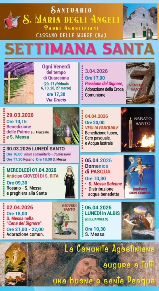 Nelle due parrocchie cassanesi e presso il Santuario della Madonna degli Angeli sono numerosi gli appuntamenti in vista del cuore dell’anno liturgico, a partire da domenica, così come illustrato nelle locandine.