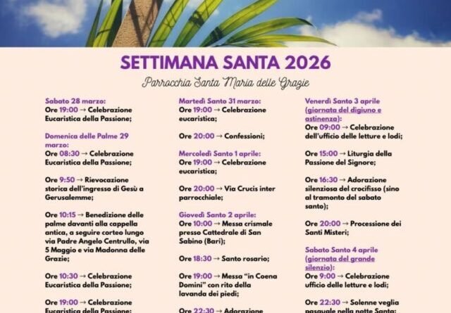 “In questa Quaresima il nostro sguardo è rimasto fisso sul Crocifisso, il segno dell’Amore che non conosce confini – scrive in un messaggio il parroco di “Santa Maria delle Grazie”, don Mimmo Frappampina – In quel corpo donato abbiamo deposto le nostre fatiche, le nostre solitudini e le speranze di un mondo assetato di pace. Ora, alle soglie della Settimana Santa, quel legno non ci appare più solo come uno strumento di dolore, ma come l’albero della vita che già profuma di Risurrezione. Vi invito a vivere questi giorni santi non come spettatori, ma come protagonisti di un incontro: lasciamoci abbracciare da quelle braccia spalancate sulla Croce, per poi correre, con lo stupore di Maria Maddalena, incontro al Risorto. Che la gioia della Santa Pasqua entri nelle vostre case, asciughi ogni lacrima e riaccenda la luce della speranza nei vostri cuori”.