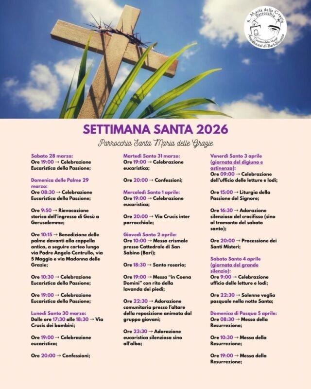 “In questa Quaresima il nostro sguardo è rimasto fisso sul Crocifisso, il segno dell’Amore che non conosce confini – scrive in un messaggio il parroco di “Santa Maria delle Grazie”, don Mimmo Frappampina – In quel corpo donato abbiamo deposto le nostre fatiche, le nostre solitudini e le speranze di un mondo assetato di pace. Ora, alle soglie della Settimana Santa, quel legno non ci appare più solo come uno strumento di dolore, ma come l’albero della vita che già profuma di Risurrezione. Vi invito a vivere questi giorni santi non come spettatori, ma come protagonisti di un incontro: lasciamoci abbracciare da quelle braccia spalancate sulla Croce, per poi correre, con lo stupore di Maria Maddalena, incontro al Risorto. Che la gioia della Santa Pasqua entri nelle vostre case, asciughi ogni lacrima e riaccenda la luce della speranza nei vostri cuori”.