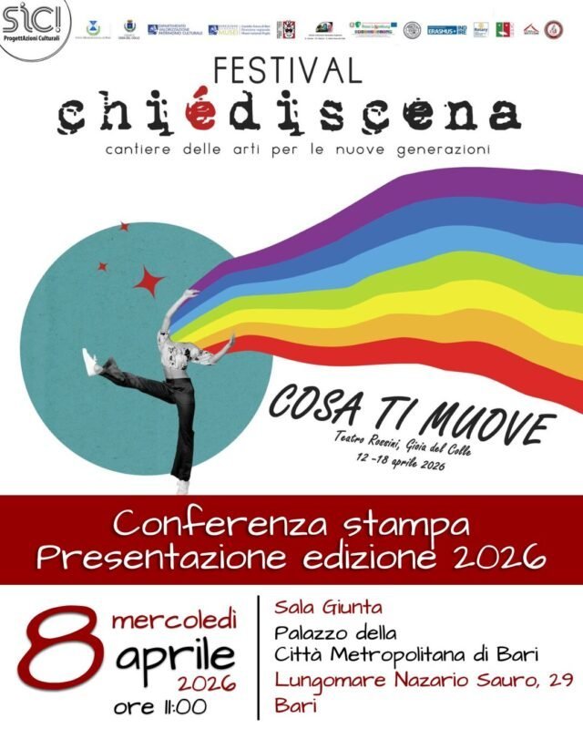 Domani, mercoledì 8 aprile 2026, alle ore 11:00, nella sala Giunta del Palazzo della Città Metropolitana di Bari, si svolgerà la conferenza stampa di presentazione della nona edizione del Festival “Chièdiscena”, cantiere delle arti per le nuove generazioni promosso e curato dall’associazione culturale Sic! ProgettAzioni Culturali.