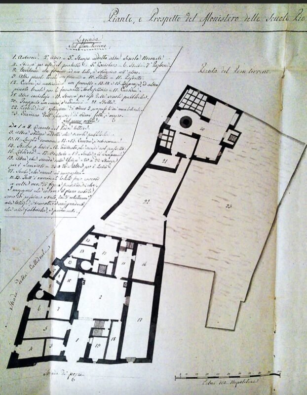 «Ancor prima dell’istituzione della “ruota dei proietti/esposti ” – annota de Carolis – in quei locali posti al pian terreno erano allocati le cucine e le anti-cucine con forno e fornello, le stanze delle scuole pubbliche, dispense, la stanza per uso del picchetto, due caciolari, il refettorio, le cisterne per la raccolta dell’olio e quelle per la raccolta dell’acqua, una grande cantina. È documentata anche la presenza di un antico trappeto e stalle in uso al monastero. Questo e tanto altro è stato oggetto di segnalazioni ai sindaci e alle autorità competenti, ed anche oggetto di studio con gli scritti e i documenti editati dagli archiettetti Angela Rossi e Pino Giannini nei preziosi “Quaderni” del centro studi di storia, fondato dal compianto Prof. Matteo Pugliese».
