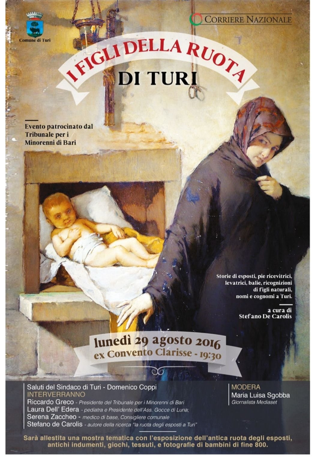 «Sempre nel 2014, alla presenza dell’Assessore competente, ho documentato fotograficamente gli ambienti interni e la suddetta finestrella, che attualmente si affaccia sulla scala in uso alla Caserma dei Carabinieri. Infine, nel 2016, con il patrocinio del Tribunale dei Minorenni di Bari, organizzai, con la collaborazione del Procuratore di Bari, un interessante convegno sul baliatico comunale e l’esposizione dell’infanzia abbandonata».