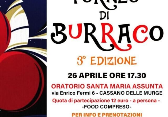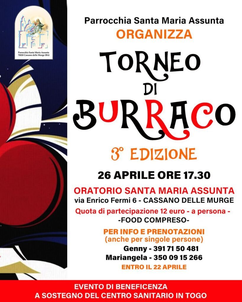 network Torneo di burraco solidale il 26 aprile 21 Aprile 2026 admin Terza edizione del Torneo di burraco solidale organizzato dalla Parrocchia “Santa Maria Assunta” di Cassano delle Murge. Info in locandina.