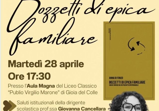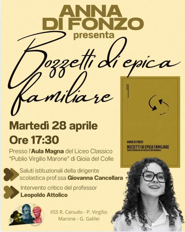 Martedì 28 aprile alle ore 17,30 nell’Aula magna del “Publio Virgilio Marone” di Gioia del Colle presenteremo “Bozzetti di epica familiare” della sedicenne Anna Di Fonzo e discuteremo su questa realtà letteraria.